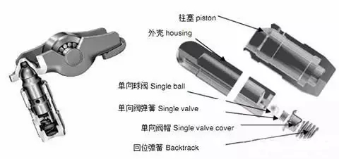 发动机工作时,当气门关闭,机油经挺杆体侧面的油孔和柱塞的孔道进入柱塞腔,推开单向阀直入挺杆体腔(高压仓),柱塞便在挺杆体腔的油压及弹簧的作用下上升,压紧气门推杆。此时柱塞的上升力不足以克服气门弹簧的张力,气门不会被打开而仅是消除了整个气门机构中的间隙。此时挺杆体腔已充满油,单向阀在油压及弹簧的作用下关闭,切断了油路。